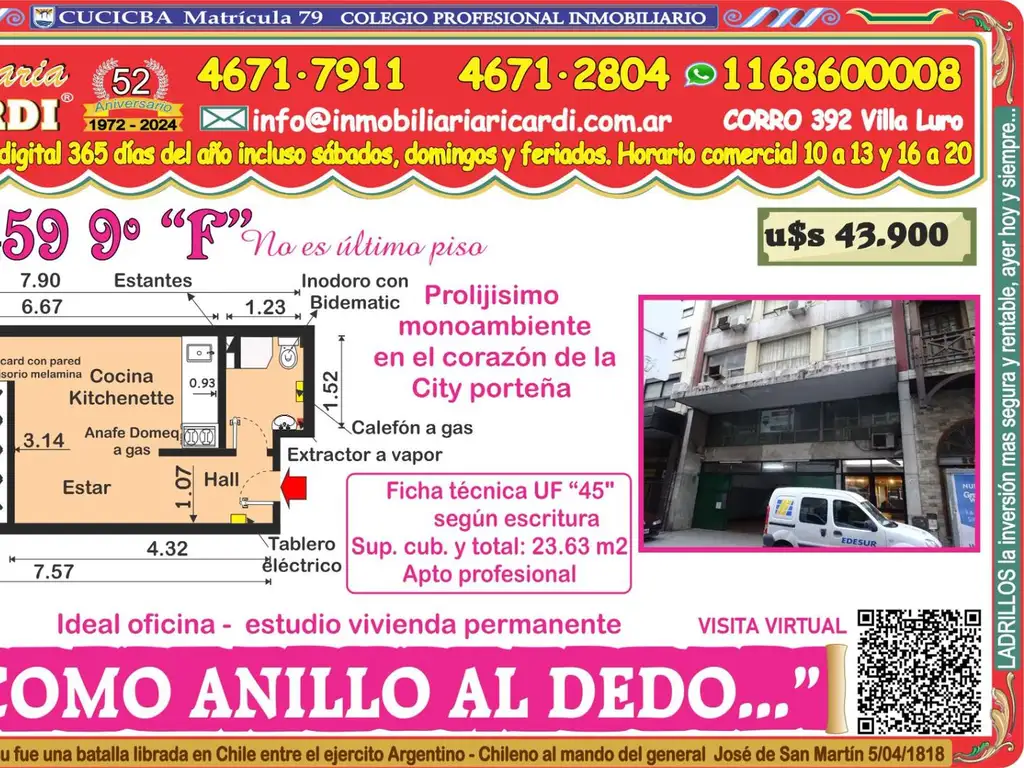 La Inmobiliaria RICARDI NO garantiza que el inmueble cumpla con el certificado de conservación de fachadas y balcones (Ley 257) tampoco efectúa el estudio de títulos, ni analiza los alcances del Código de edificación y no será responsable por los vicios ocultos o redhibitorios que competen a quien corresponda. Advertimos al adquirente que las instalaciones eléctricas, de gas natural y-o sanitarias pueden NO solo no tener un correcto y adecuado funcionamiento técnico sino que además puede NO cumplir con las exigencias actuales de METROGAS- EDESUR- EDENOR - siendo a cargo del adquirente que implique su puesta en valor y-o funcionamiento.