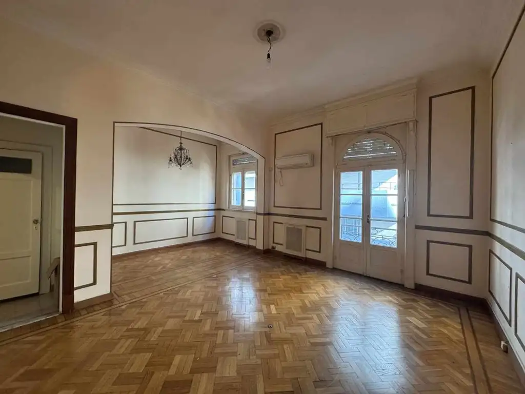 Living comedor muy amplio con techos altos, pisos de parquet en excelente estado y molduras clásicas