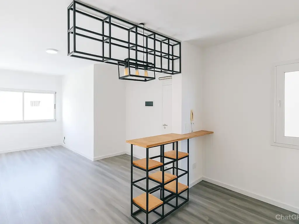 Cocina renovada a nuevo con bajo mesada, alacenas y barra integrada al living