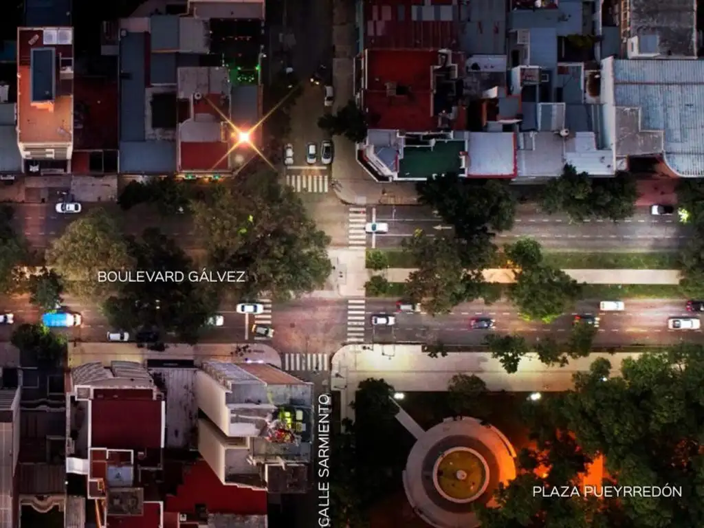 en 17 pisos altos donde se distribuyen los diferentes usos: en la ochava y en diagonal a la plaza Pueyrredón y el boulevard se extiende el elegante jardín de ingreso con un lobby imponente en triple altura, sobre calle sarmiento se dispone el ingreso a cocheras, dispuestas en 4 niveles con holgadas dimensiones.