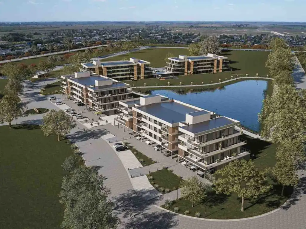 La propiedad se destaca por su patio con asador y jardín con vista panorámica hacia área verde y lago. Distribución estratégica de 4 ambientes con diseño moderno y terminaciones premium que conectan espacios internos y externos. La unidad comprende 2 dormitorios, 2 baños completos, toilette, living-comedor, cocina con desayunador, vestidor, lavadero, estudio y patio con jardín.
