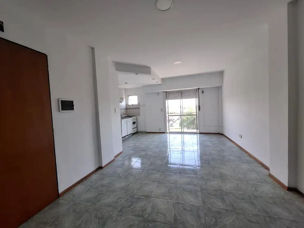 Living comedor con cocina integrada y salida al balcón.