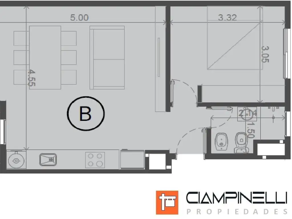 hacia el frente de la unidad se encuentra el living comedor 5x4,50 mts que nos conecta con el balcón con parrilla