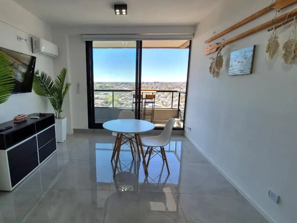 En un luminoso piso 18, con vista abierta se encuentra este hermoso departamento con balcón. 1 dormitorio con placares, baño completo con bañera y una cocina integrada junto al living comedor. Incluye cochera cubierta en subsuelo.