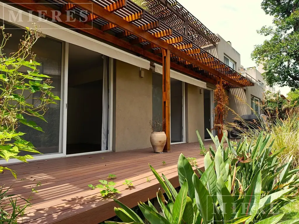 Hall de entrada. Living - comedor amplio muy luminoso y al deck y jardin en común. Cocina semi integrada con muebles alto y bajo mesada, horno a gas y barra desayunadora o pasa platos.