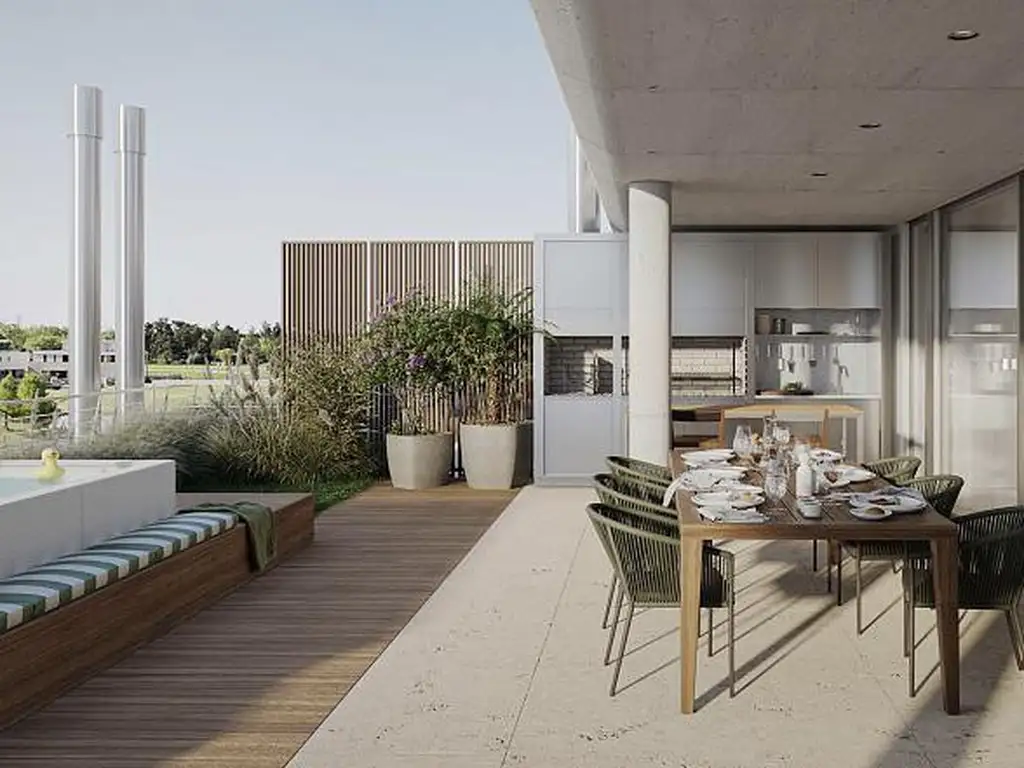 Todo esto se complementa con más de 1.200 m2 de amenities vinculados al agua y al bienestar: marina con amarras, pileta, gimnasio, coworking, wine bar, huerta, espacios verdes y servicios que elevan la experiencia de vivir o invertir frente al río.