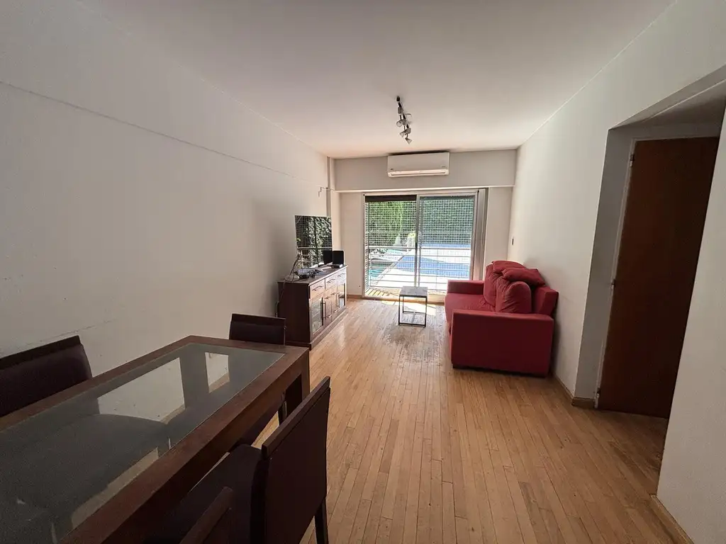 Living comedor con pisos entablonados y salida al balcón.