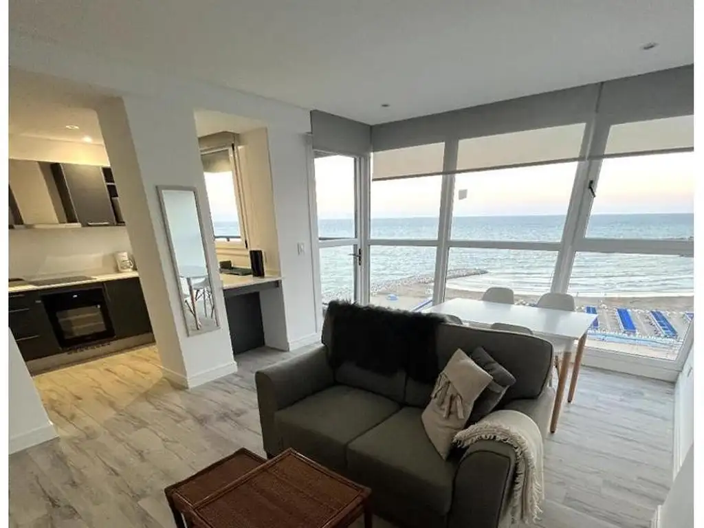 Amplio estar comedor con vista al mar. Cocina semi integrada con barra desayunadora. Toilette de recepción.
