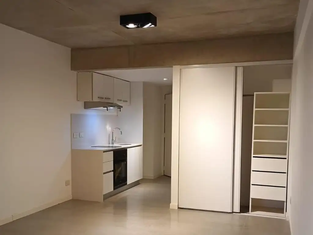 Amplio ambiente con salida a un balcón. Cocina integrada con muebles bajo mesada y alacenas.