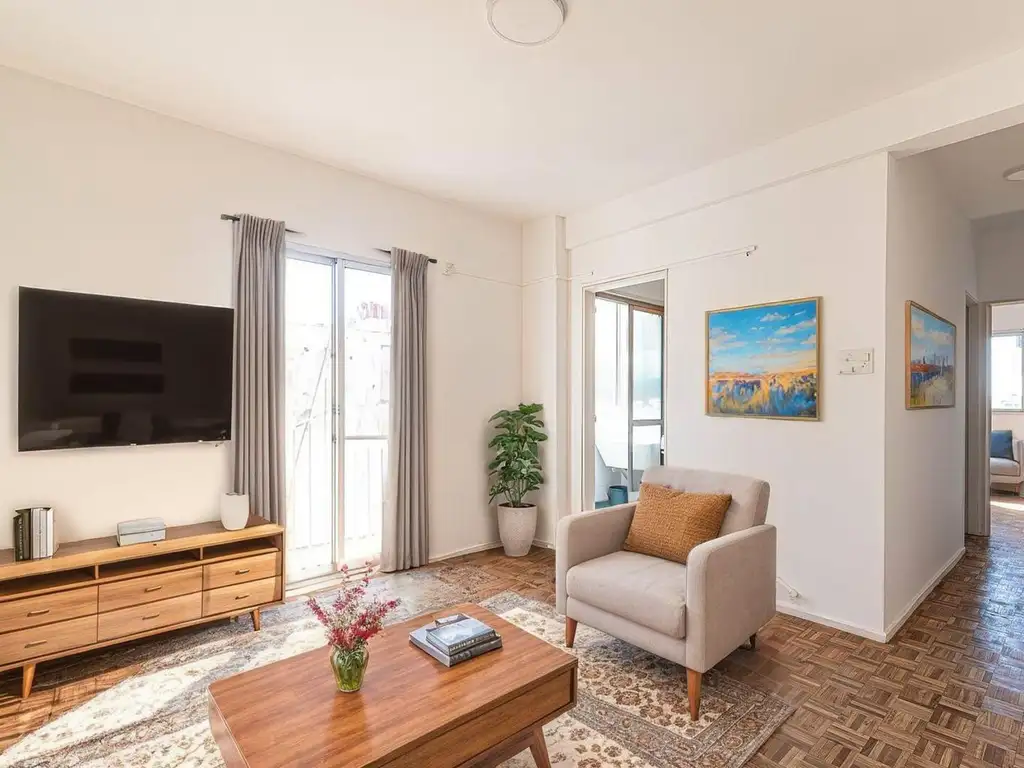 Práctico departamento de dos ambientes compacto, al contrafrente, con vista abierta a Ciudad desde su dormitorio. Muy luminoso y sol por la tarde.
