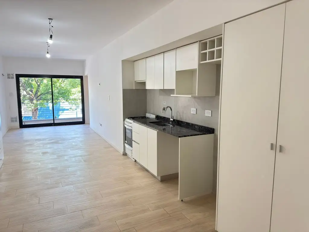 Excelente departamento de un ambiente, divisible, cocina integrada, balcón al frente, muy luminoso y aireado, el ambiente principal es de 10 metros de largo por 2,8 de ancho, cocina con muebles bajo y sobremesada, cocina a gas, instalación preparada para colocación de aire acondicionado, calefón, pisos de cerámicos simil madera en todos los ambientes, cerramientos Linea Modena de Aluminio color Negro. Puertas interiores de madera con molduras, puerta de ingreso Ignífuga, rejas de hierro color negro en el Balcón, espacio de guardado de bicicletas en planta baja.