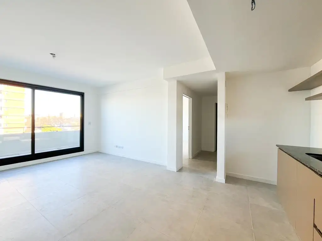 Departamento de dos ambientes con balcón corrido, luminoso y funcional, Living comedor diario con cocina americana equipada con anafe y horno eléctricos, alacena, mesada de granito y muebles bajo mesada. Baño completo con modernos revestimientos. Habitación con placard completo y salida al balcón con conexión al living comedor diario.