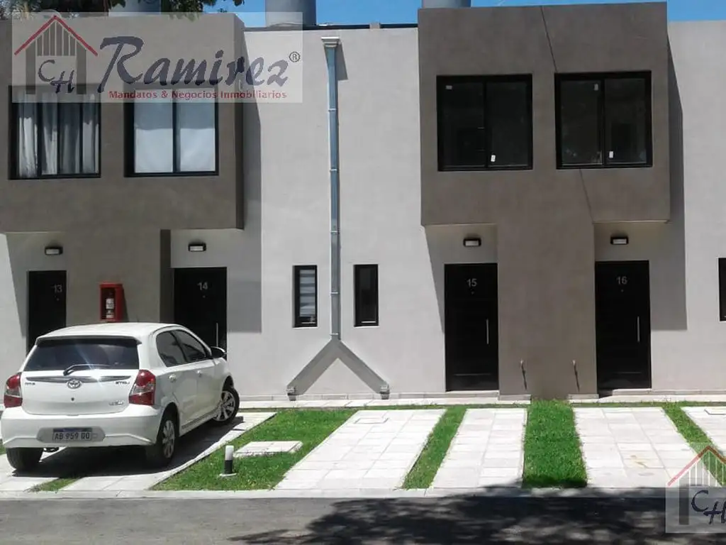 Duplex 3 amb. a estrenar. Planta baja: living comedor, cocina integrada, barra desayunadora y toilette. Planta alta: 2 dormitorios y baño completo. Todos cuentan con cochera y fondo libre. El Condominio tiene seguridad, salon de usos múltiples y piscina. Excelente zona en expancion. A metros de colectivos, comercios y Acceso Oeste. Financia 40% del valor hasta en 24 meses. Ultimas 2 unidades disponibles!.