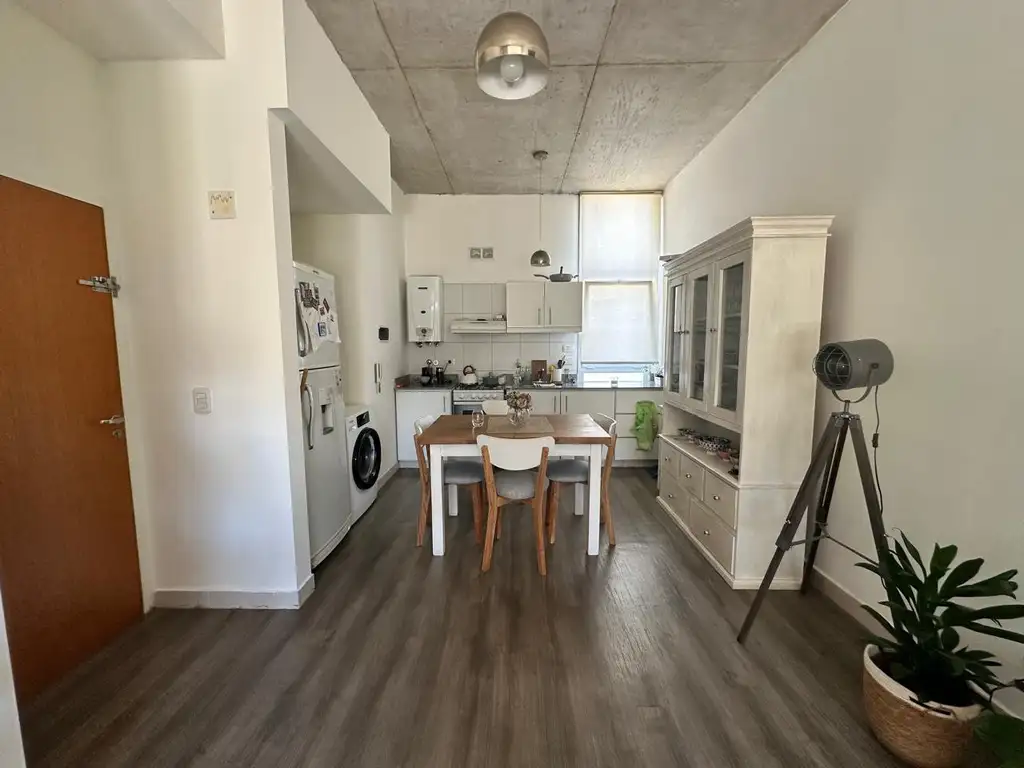 Al ingresar nos encontramos con un gran y luminoso living comedor integrado a la cocina. Los techos de hormigón visto aportan al espacio un carácter especial, moderno y al mismo tiempo le otorga calidez. Un gran ventanal tiene salida a un espacio exterior para poder disfrutar del aire libre y donde también se encuentra la zona de lavadero.