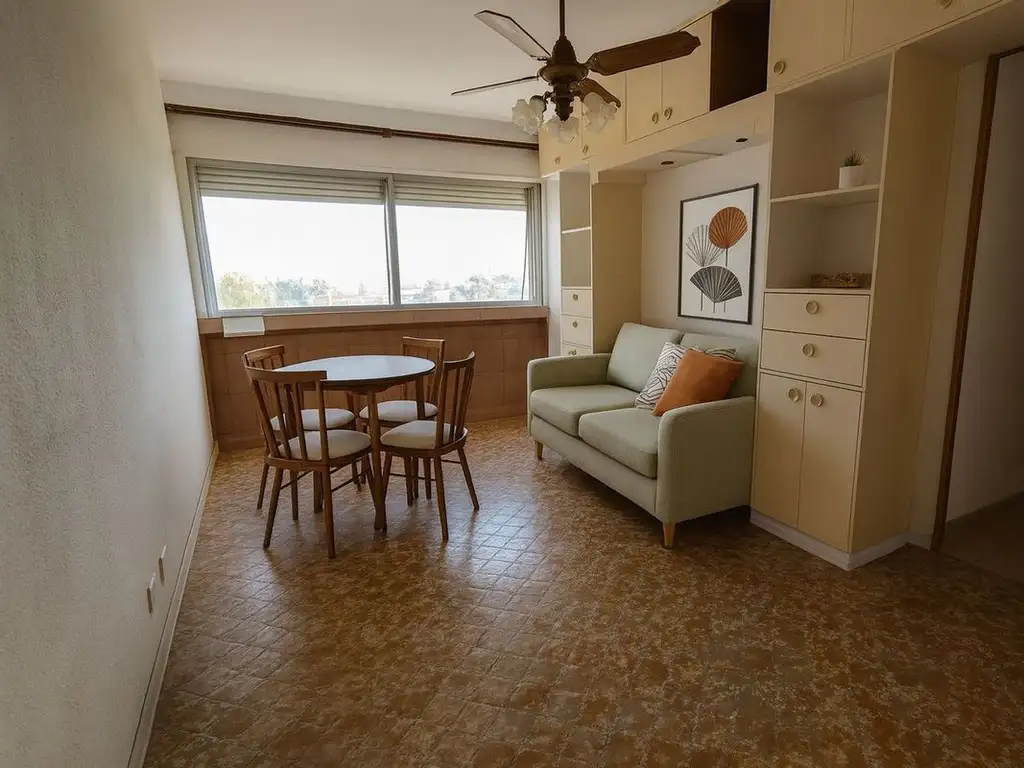 La propiedad cuenta con cocina equipada con artefactos a gas y ventana al exterior. El living ofrece buena luminosidad y espacios de guardado estratégicamente distribuidos. Los dos dormitorios permiten diferentes configuraciones de distribución.