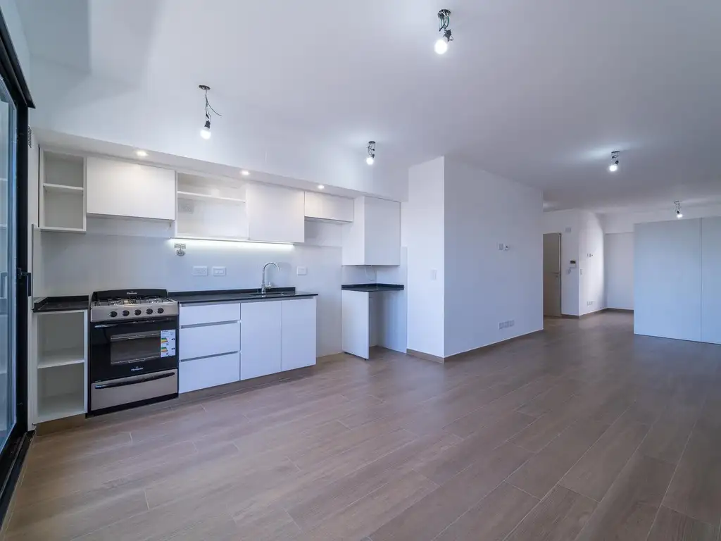 Luminoso y amplio ambiente divisible con cocina integrada, muebles completos altos y bajos. Gas natural. Agua caliente por termotanque eléctrico.