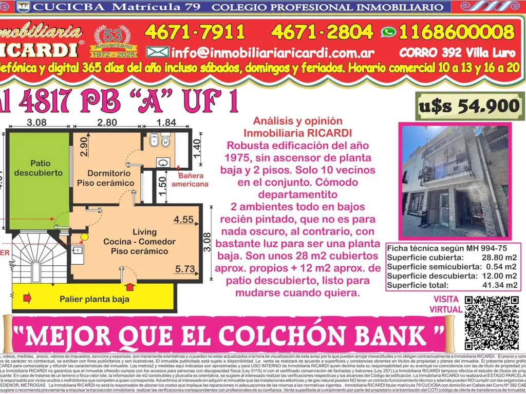 Son unos 28.80 m2 cubiertos propios + 12.00 m2 de patio descubierto, listo para mudarse cuando quiera.