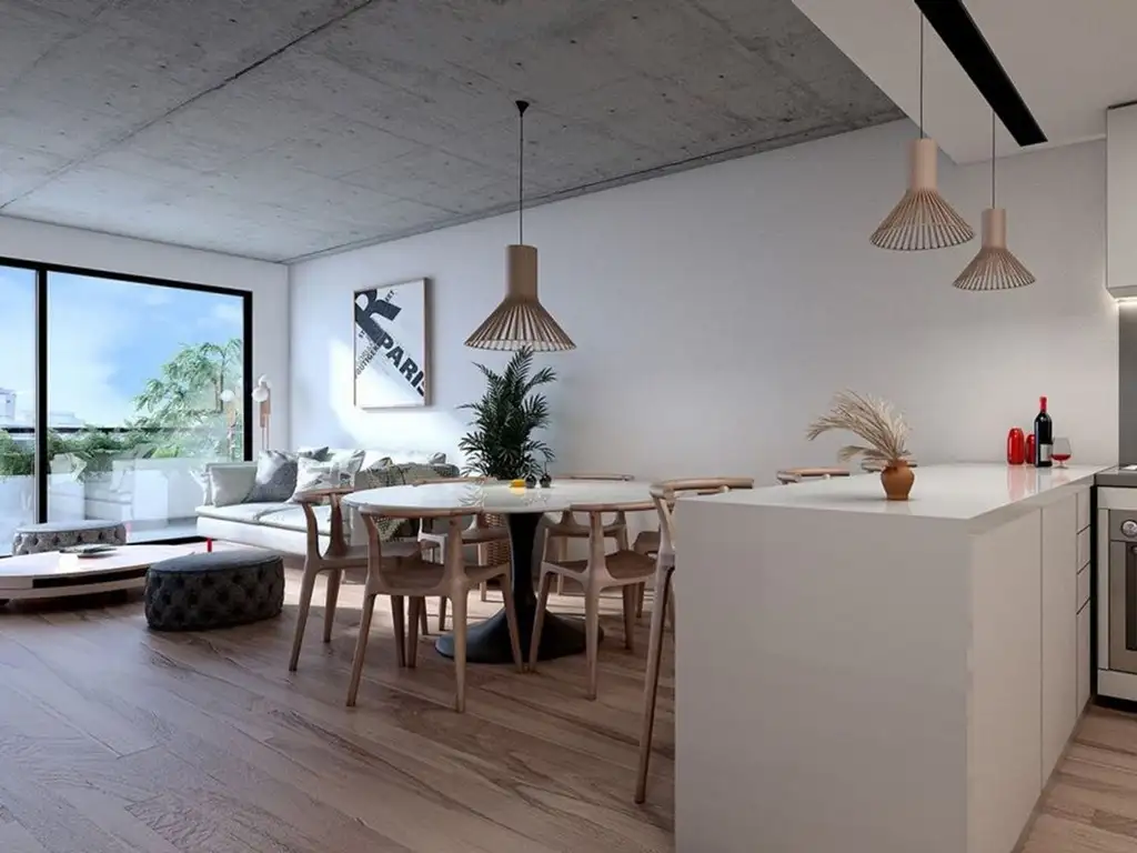 La unidad se ubica en un primer piso al contrafrente y cuenta con una cocina equipada con muebles bajo mesada y alacena, además de una barra desayunadora que separa el espacio del living-comedor, un baño completo y un balcón de 5 metros.