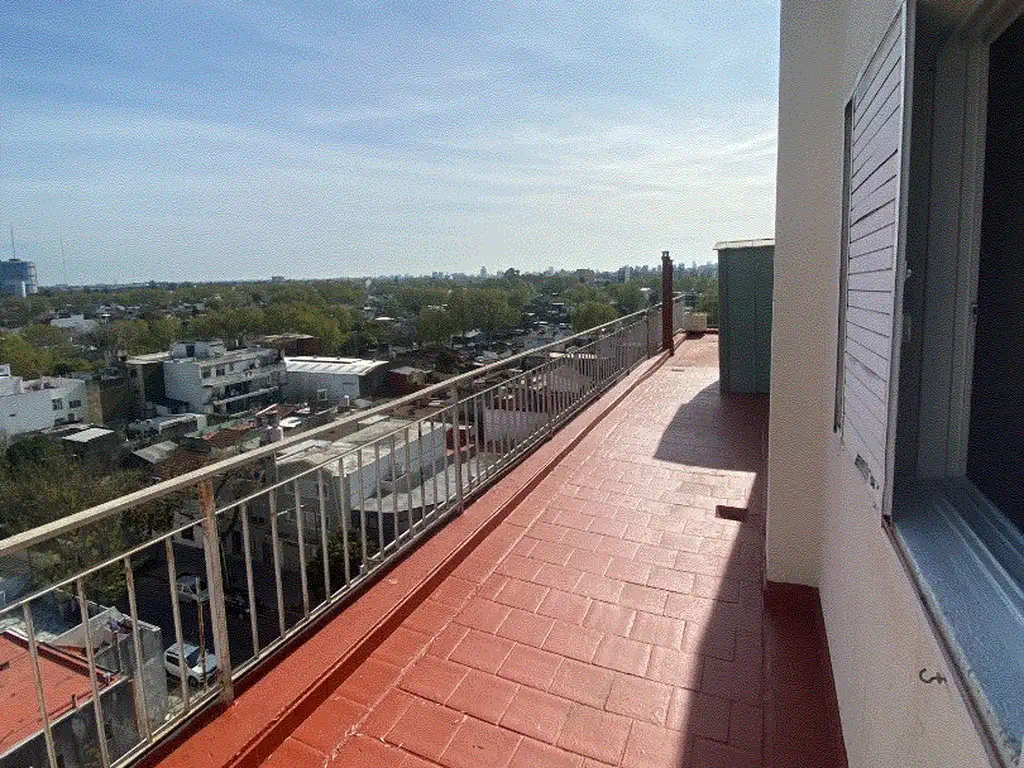 • Balcón-Terraza de 14 x 2,45 con piso revestido con baldosas impermeabilizadas, armario de fibra de vidrio color gris.-