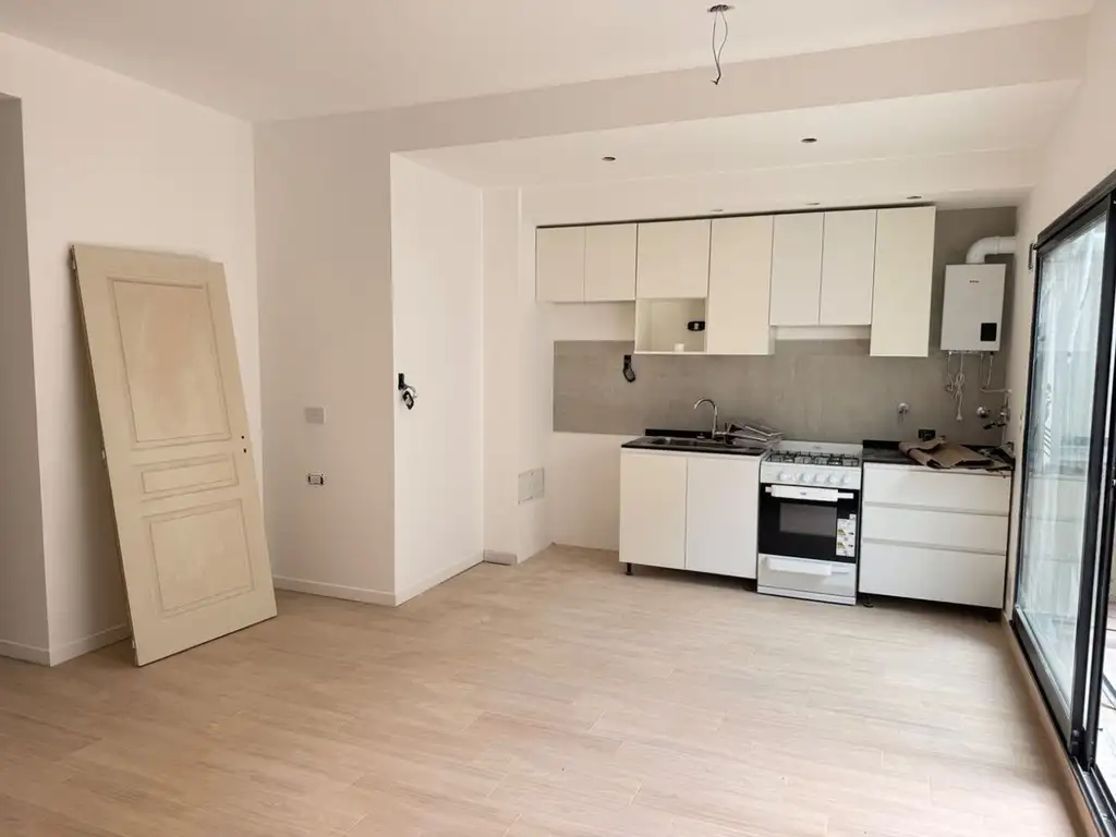 Ingresamos al departamento, ambiente principal, living comedor con cocina integrada y totalmente equipada, muebles bajo y sobre mesada, lugar para Lavarropas con muebles de guardado, salida a gran patio, baño completo, Dormitorio principal en suite con baño completo. El departamento tiene preinstalación de aire acondicionado en sus ambientes, pisos de porcelanato en todos los ambientes, baños con losas y griferías de primera calidad.