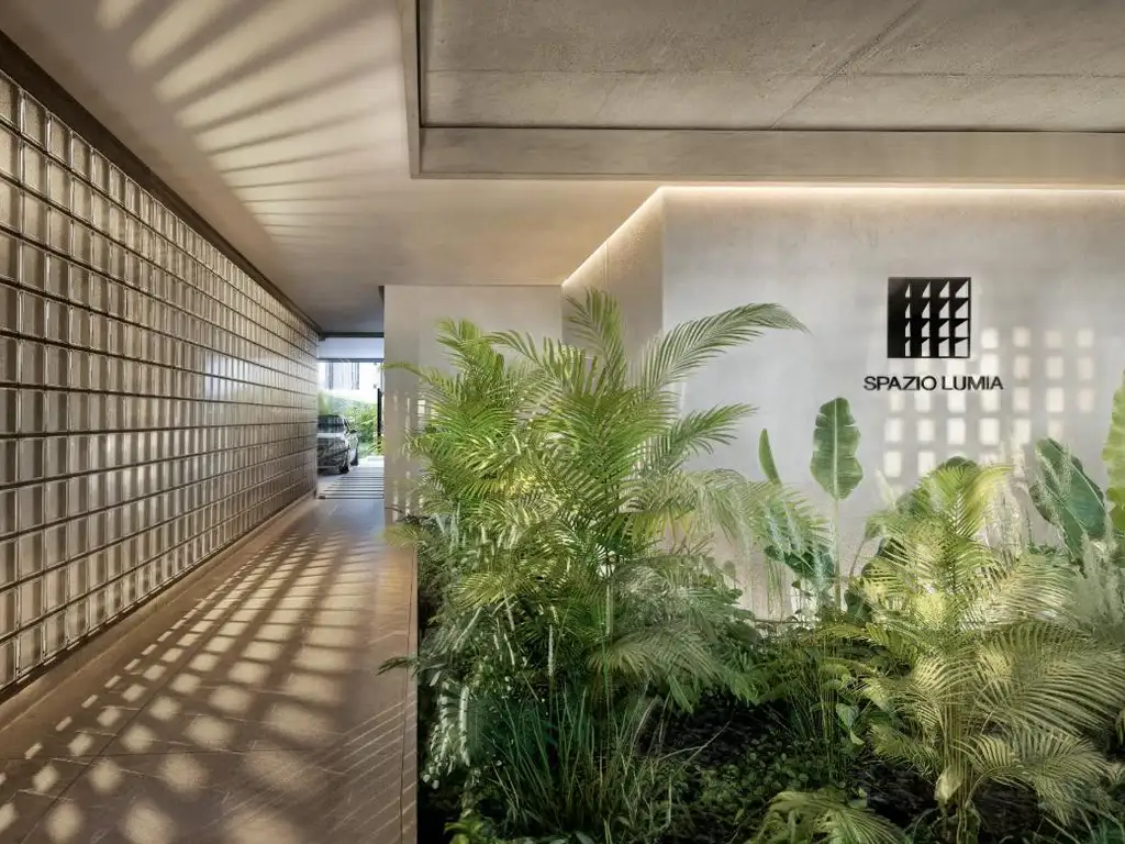 El concepto de luz en movimiento se extendió tanto a los espacios comunes como a los amenities. En planta baja una pantalla de ladrillos de vidrio, de acuerdo al tipo y hora de iluminación dibuja diferentes motivos sobre los volúmenes construidos.