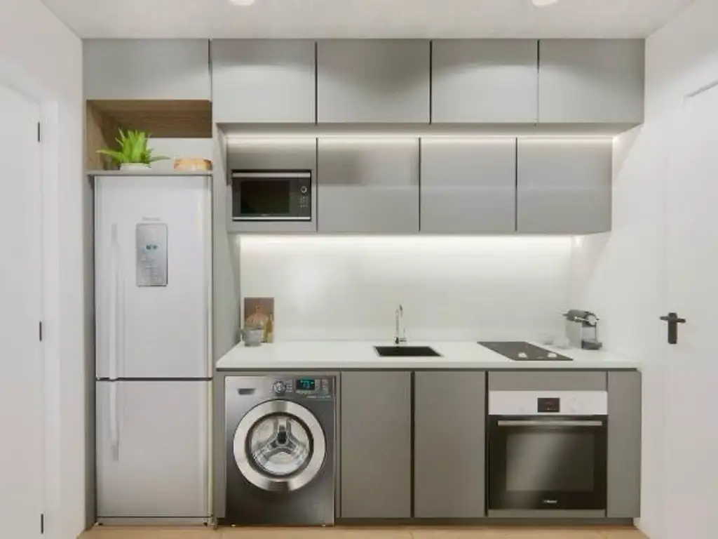 Monoambiente con cocina, baño completo, ambiente integrado y balcón aterrazado.