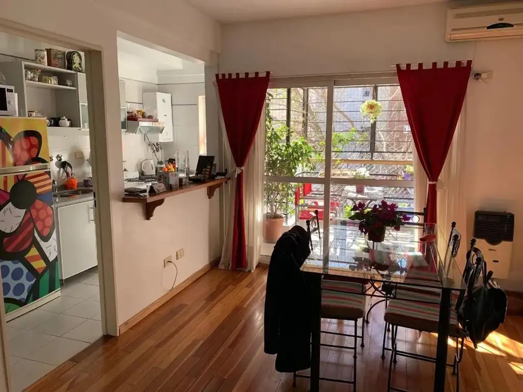 Cocina semi integrada(fácilmente se puede volver a independizar),barra de madera,mucho espacio de guardado y lavadero. Living y cocina con salida a balcón.