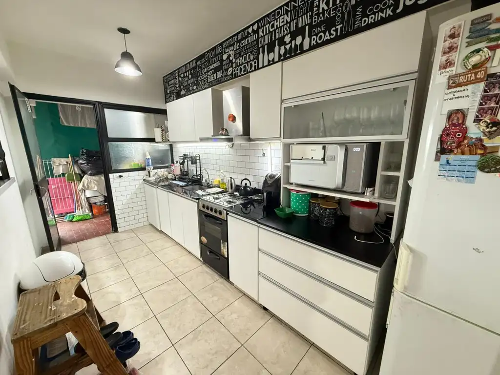- Cocina: Totalmente independiente y renovada a nueva. Cuenta con abundante espacio de guardado (muebles bajo mesada y alacenas) y salida a un sector del balcón utilizado como lavadero.