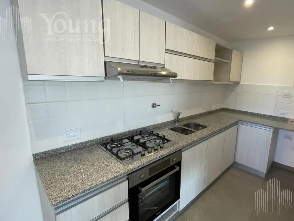 Cocina integrada con muebles altos y bajos con mesada de granito