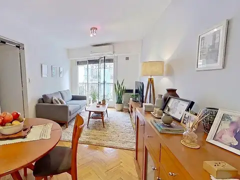 Al ingresar, nos encontramos con un amplio living comedor, con piso de parquet, a.A., Con ventanal permitiendo ventilacion natural y luminosidad a toda la unidad y salida a balcon terraza propio con parrilla,