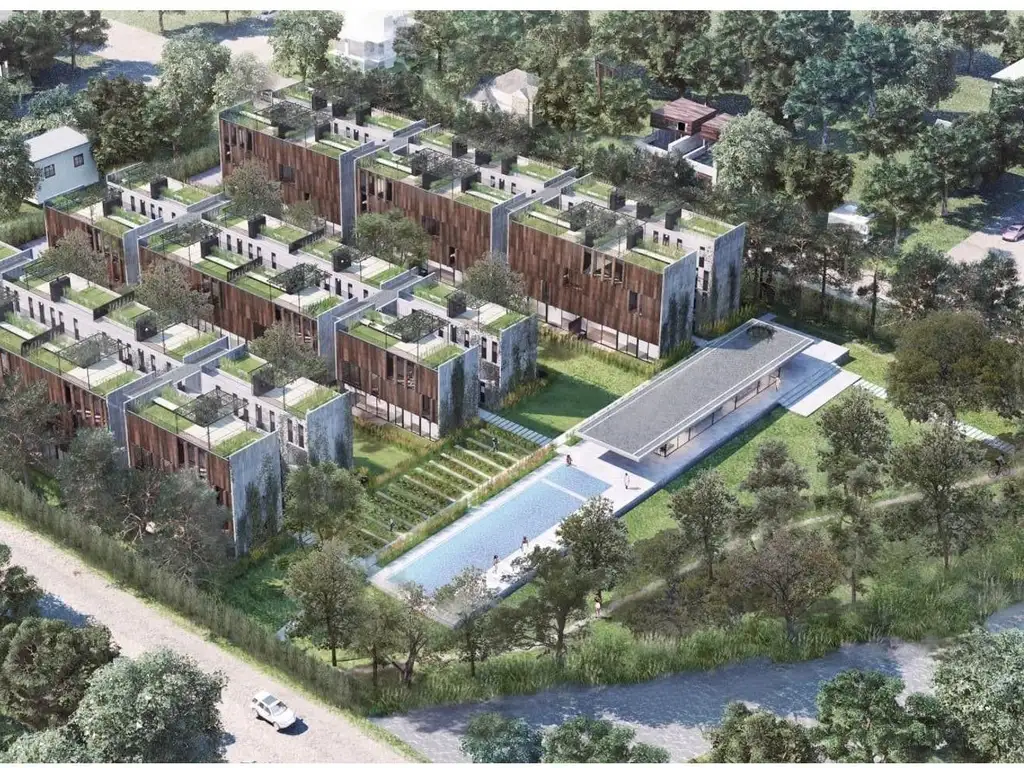 Hay tres tipologías de viviendas, planta baja de dos dormitorios y escritorio con jardín propio y cerco de madera perimetral, primero y segundo piso de dos dormitorios con patio semicubierto ventilado con parrilla y tercer piso de dos dormitorios con terrazas verdes propias deck y parrilla.
