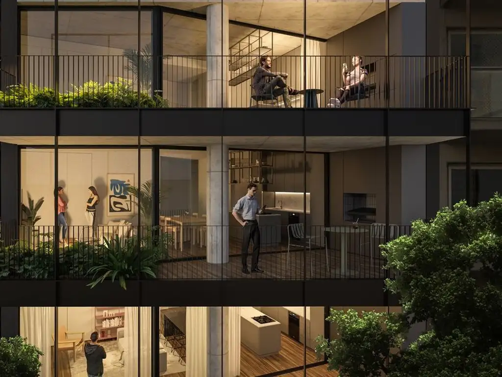 . Balcón Pisos de porcelanato rectificado símil madera o similar de primera calidad Cielorraso en hormigón visto. Baranda en Herrería. Parrilla Individual para cada unidad.