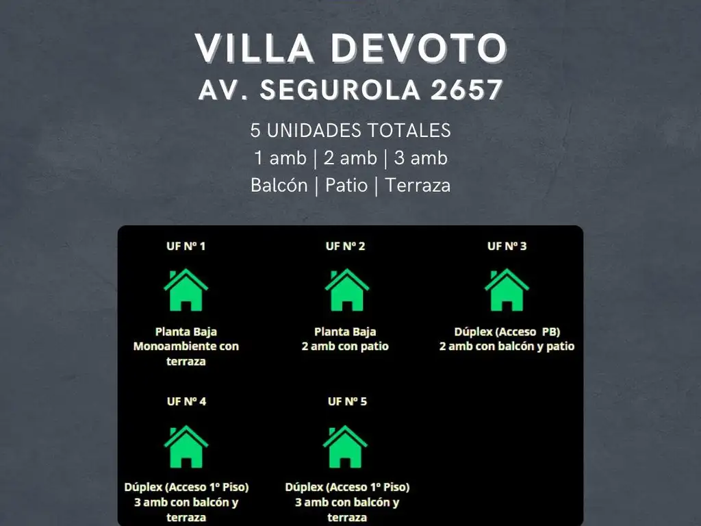 El mismo dispondrá de un total de 5 unidades funcionales de 1, 2 y 3 ambientes. De las cuales, dos de ellas cuentan con acceso independiente desde la calle Mónaco, y otras tres con acceso compartido sobre Av. Segurola.