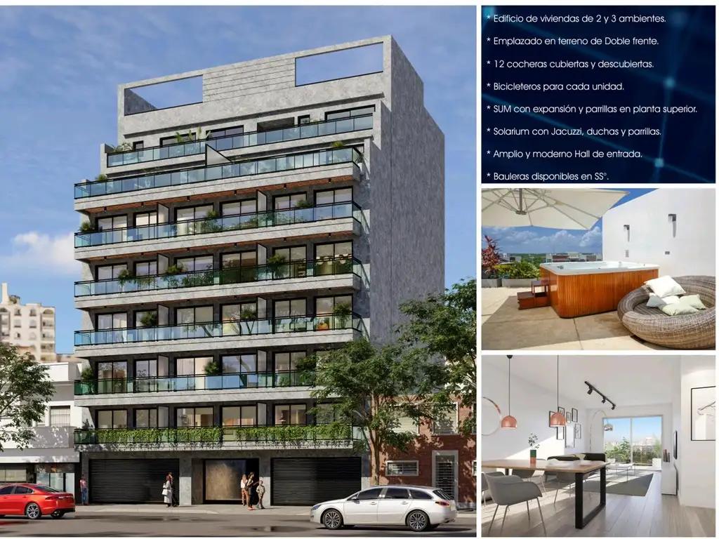 Edificio de viviendas de 1, 2 y 3 ambientes, emplazado en terreno de doble frente. 12 cocheras cubiertas y descubiertas. Bicicleteros para cada unidad. SUM con expansión y parrillas en lla planta superior. Solarium con jacuzzi y duchas. Amplio y moderno hall de entrada. Bauleras disponibles en SS. Ubicación privilegiada a metros de Av. Francisco Beiró.