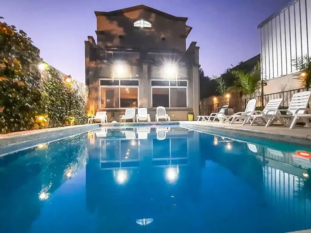 Pileta climatizada completa con solarium, reposeras y sombrillas.