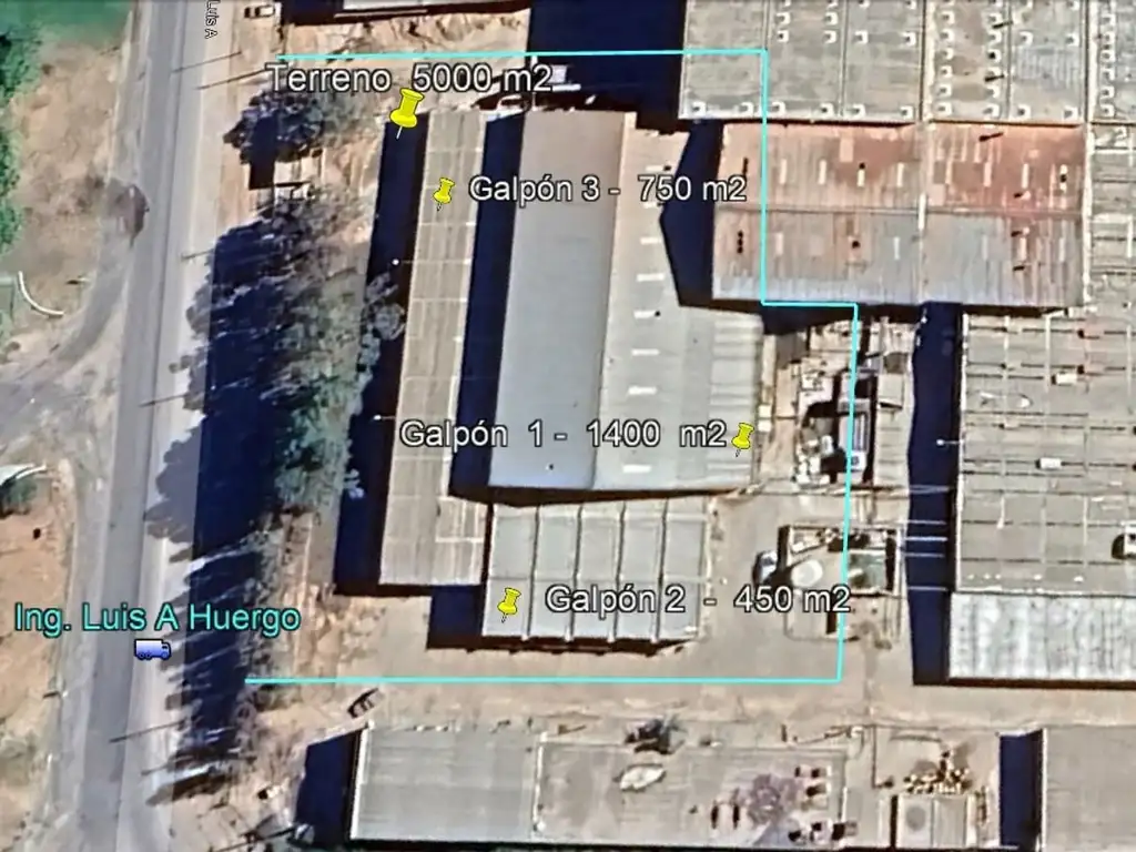 Es un predio de 5000 m2 con tres galpones uno al lado del otro, el 1º galpón tiene 1400 m2 y tiene una altura de 12 metros, al lado tiene un galpón de 450 m2 con un altillo de aprox. 100 m2 que el ingreso es por escalera y al lado que se comuica por una puerta peatonal está el galpón de 750 m2 que hay que realizarle mejoras importantes, el ingreso al predio es por calle Ing Huergo.