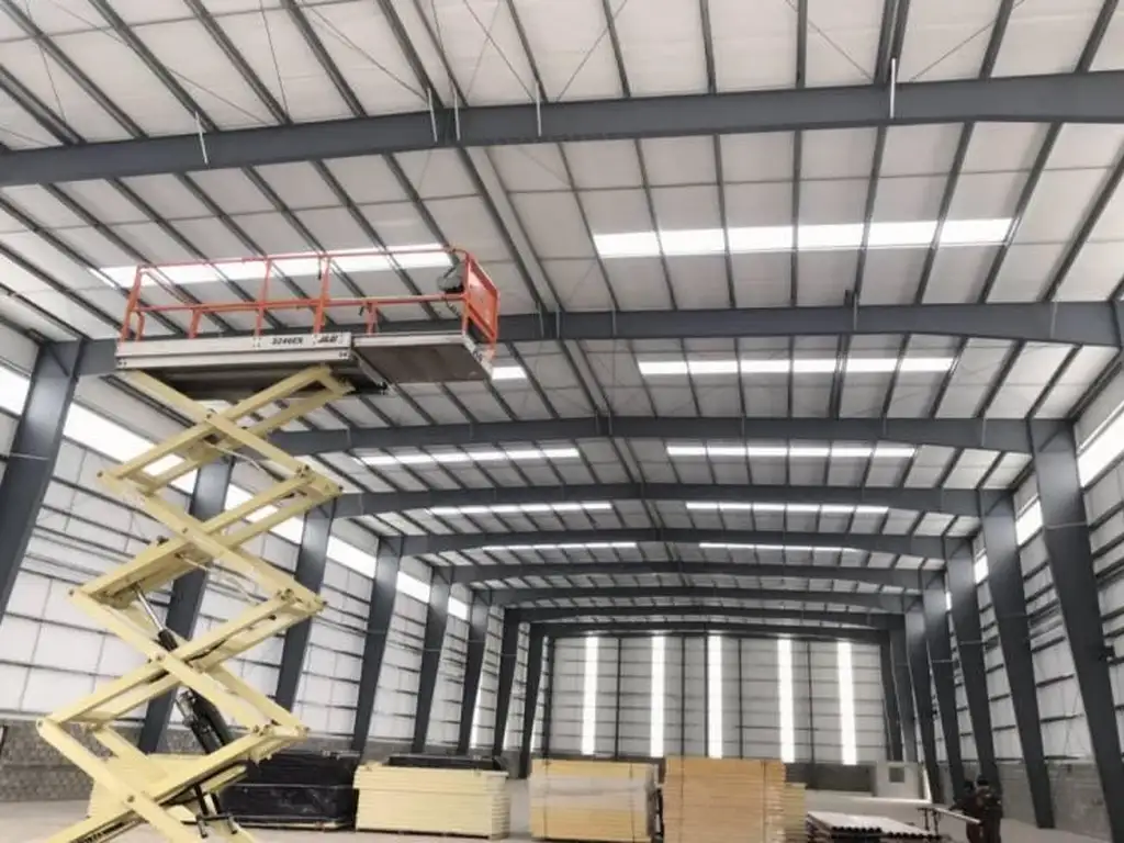 El depósito posee estructura metálica de alma llena de 9 metros de altura,cubierta metálica de chapa sinusoidal galvanizada calibre 25, pórticos de alma llena en perfiles W soldados, así como los parantes en ambos frentes de modulación de 6,33 m, aislación térmica en cubierta de lana de vidrio espesor 50 mm con recubrimiento de Tyvek y pisos con incorporación de MACROFIBRAS. Además cuenta con cortina metálica de 4,00 m x 4,50 m inyectada de poliuretano y iluminación natural mediante chapas acrílicas tipo Acrilyt G-10.