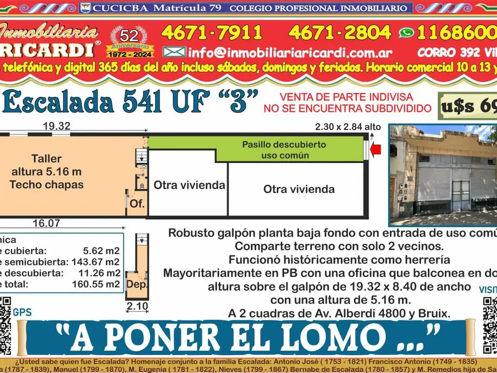 Robusto galpón en planta baja fondo con entrada de uso común. Comparte terreno con solo 2 vecinos. Funcionó históricamente como herrería