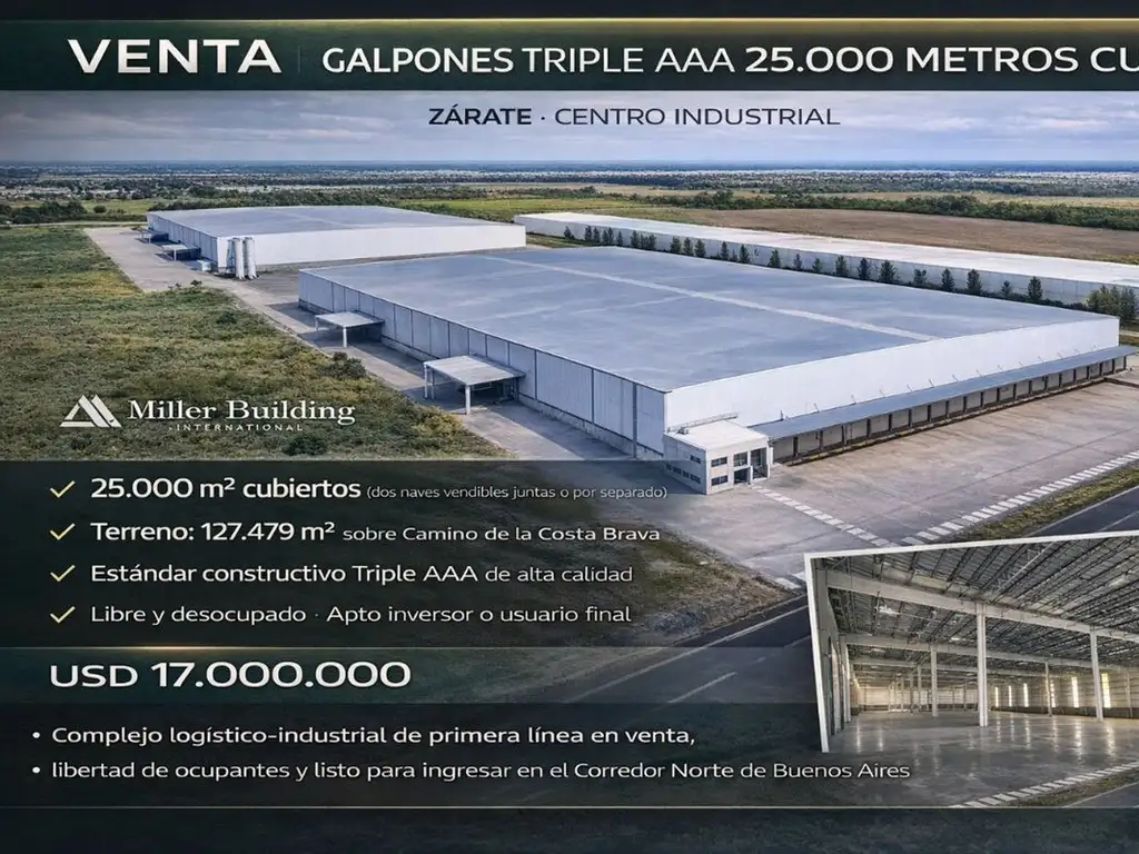 COMPLEJO DE NAVES TRIPLE AAA de Primera Línea en Venta – Centro Industrial Zárate 25.000 metros cubiertos NAVES TRIPLE AAA DESAROLLADAS POR Miller Building International TERRENO 127.479 METROS