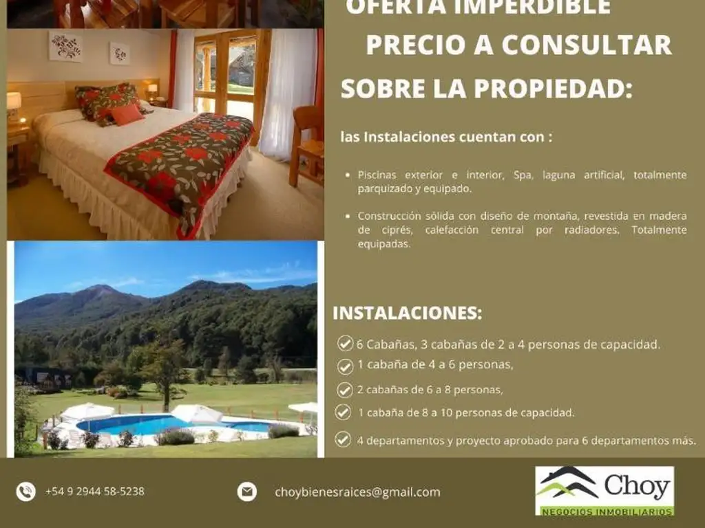 Se trata de un Complejo de Cabañas de alquiler turístico, muy reconocido, sobre 2 has. ubicado sobre Ruta 40, a metros del acceso al Cerro Bayo y a 3 km., del centro.