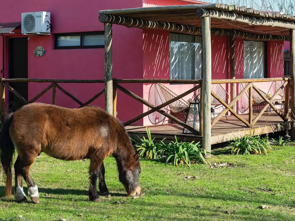 El predio ofrece una amplia variedad de amenities para el disfrute de los huéspedes, entre los que se destacan: piscina con solarium y reposeras, piscina para niños, parrillas individuales, un local con parrilla para reuniones familiares y de amigos, bicicletas para paseos, y un corral para caballos. Además, el complejo cuenta con un spa equipado con jacuzzi, un pequeño gimnasio y un sauna vidriado con vistas al parque. Dispone también de espacio techado para el estacionamiento de vehículos.