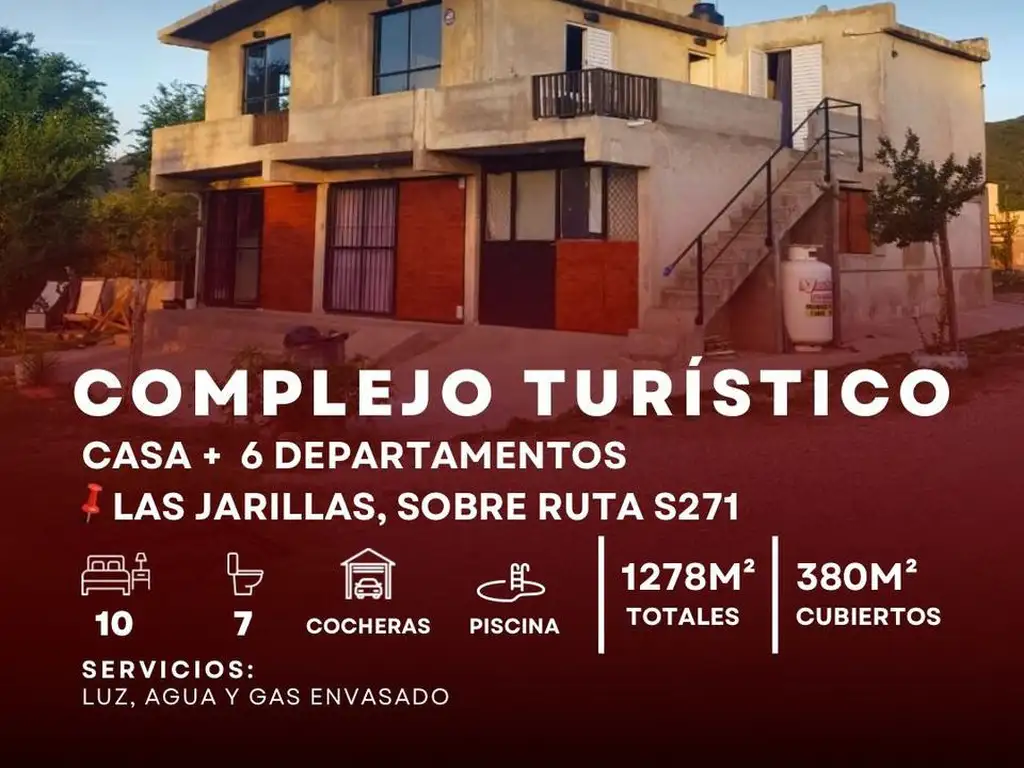 Potencial complejo turístico de casa , dos departamentos y 4 dormis, con 4 años de antiguedad, ubicado sobre la ruta S271, ideal para seguir desarrollando. Acceso excelente, al pie de las sierras.
