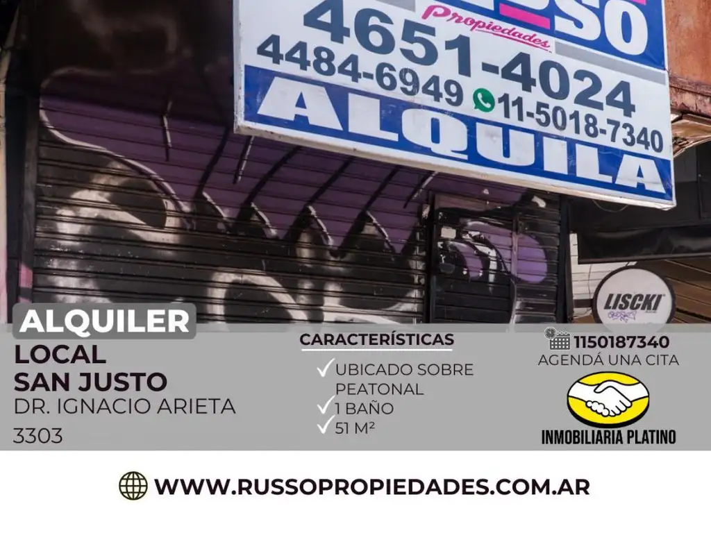 Excelente oportunidad para emprendedores y comerciantes. Se alquila local ubicado sobre la calle Arieta, en plena zona peatonal de San Justo, uno de los sectores comerciales más transitados y buscados del partido de La Matanza.