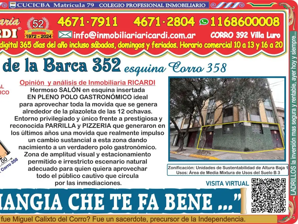 Hermoso SALÓN en esquina insertada EN PLENO POLO GASTRONÓMICO ideal para aprovechar toda la movida que se genera alrededor de la plazoleta de las 12 ochavas. Entorno privilegiado y único frente a prestigiosa y reconocida PARRILLA y PIZZERIA que generaron en los últimos años una movida nocturna muy agradable que realmente impulso un cambio sustancial a esta zona dando nacimiento a un verdadero polo gastronómico con centenares de comensales en las inmediaciones que conforman un escenario familiar.