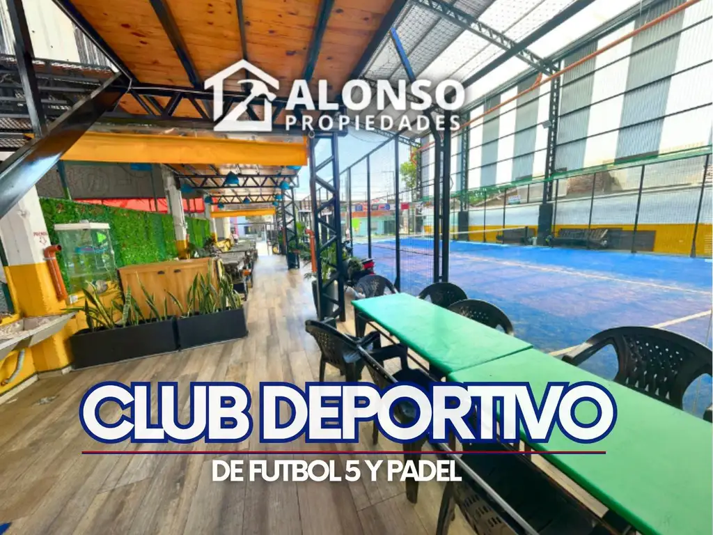 Estacionamiento para varios autos en la puerta y para motos. Buffet . Cocina . 2 vestuarios ( damas y caballeros ) . 2 canchas de futbol 5 y una cancha de Padel . Cuarto de deposito de elementos deportivos entre las dos canchas . Cuarto de deposito de dos pisos dentro del buffet . Pasillo separador de cancha / buffet con espacio para guardar cosas de limpieza , motos , bicicletas , etc.