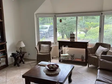 al ingresar, será recibido por un amplio y luminoso living con una distinguida biblioteca de madera. La planta baja ofrece la comodidad de un dormitorio y un baño completo. El comedor, independiente y con vistas panorámicas al parque, es el espacio ideal para reuniones familiares. La cocina, con mesada en "l" y barra desayunadora, se complementa con un lavadero y un toilette de recepción. Adyacente, el quincho de 16m² con parrilla y excelente iluminación natural se convierte en el centro social de la casa, con acceso a una terraza techada con vistas al parque.