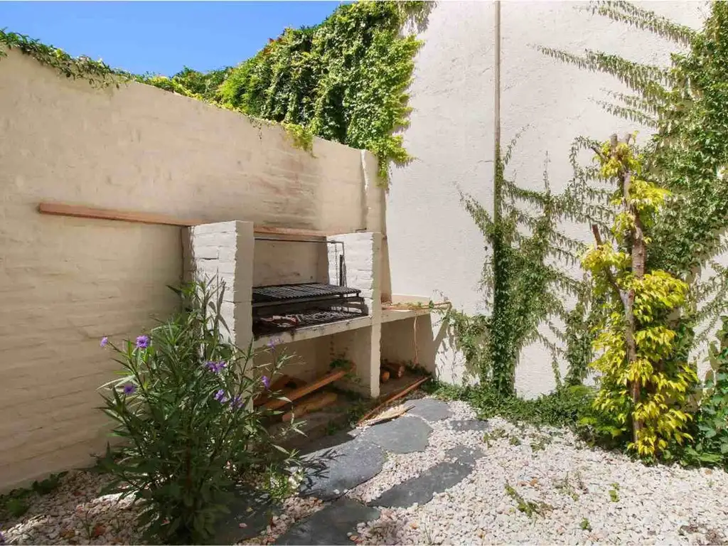 Ingresamos al edificio y nos encontramos con un hall de recepción. Al fondo, una puerta que permite el ingreso a dos pequeños espacios con baño que pueden ser utilizados como monoambiente, salón de cada departamento y tienen salida a muy lindo jardín con parrilla.