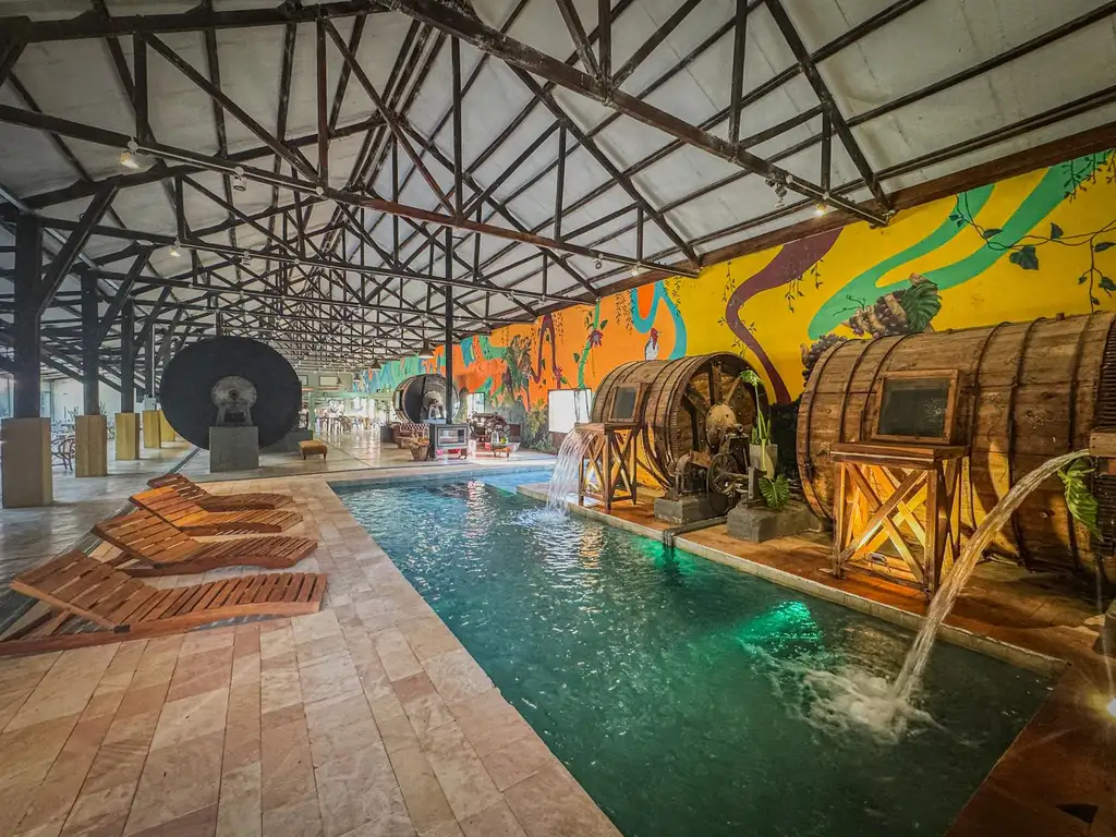 Hotel en plena selva misionera a 2km de la ciudad de Santa Ana, Candelaria, y a 50 minutos del aeropuerto y la ciudad de Posadas. Construido sobre la estructura original de una vieja curtiembre en un espacio de casi 60 hectáreas con 500m de costa sobre un afluente del rio Parana que esta a menos de 100m del limite del campo. Cuenta con 4 domos geodésicos que sirven de alojamiento cada uno con AA y jacuzzi y 55m2 cubiertos mas 75m2 de deck . Un salón principal, la vieja curtiembre, de 1.900m2 cubiertos con piscina climatizada, baños, cocina, área de estar, área de restaurante, bar, cava, expansiones a la selva, estacionamiento. Piscina en el parque, área de fuegos, kamado, horno de barro, parrilla, salón de juegos para niños, senderos en la selva y al rio con acceso a la costa. En la ribera hay una casa que es utilizada por prefectura dando seguridad y tranquilidad 24/7. Todas las instalaciones son subterráneas y la energía es provista en gran medida por paneles solares que posibilitan conectarse o no a la red publica. Un lugar cerca de todo y a la vez virgen, privado, intimo rodeado de selva, fauna autóctona como monos e infinidad de pájaros, pequeños cursos de agua, lapachos gigantes, bosques de tacuaras y asentado sobre el acuífero misionero garantizando la mas pura agua para siempre.