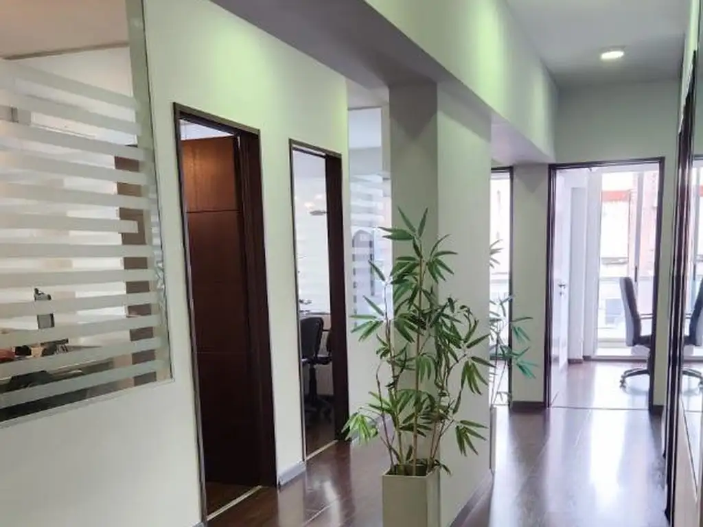 Posee doble entrada, la principal lleva a una recepción que cuenta con un toilette y desemboca a un hall de distribución que conduce a las distintas oficinas y finalmente a una amplia sala de reuniones. Cada oficina construida con divisorias de madera y vidrio de primera categoría que le brindan privacidad y un estilo elegante.