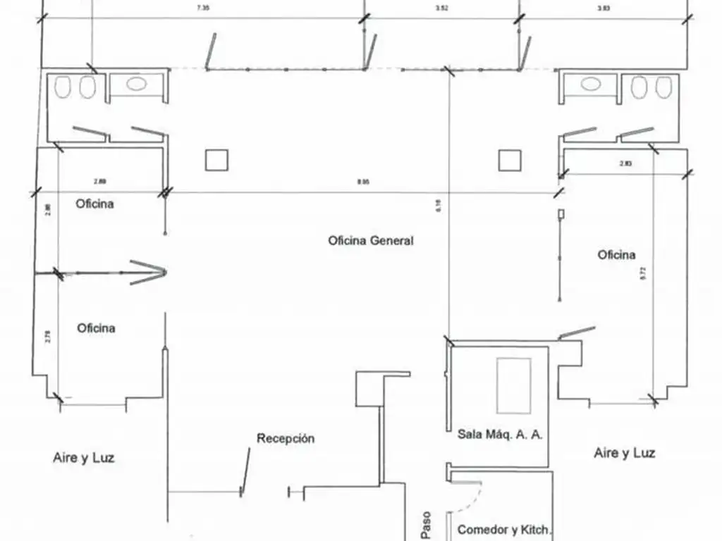 Muy buena distribución, consta de 5 despachos amplios (incluidos 2 de ellos al contrafrente y una amplia sala de reunión) y un gran área central para administrativos.